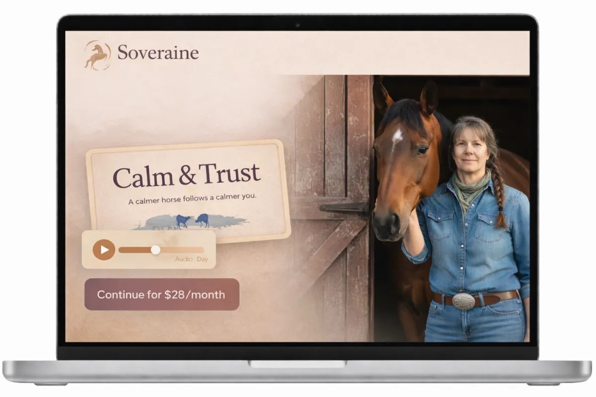 Soveraine Threshold is a continuing 28-day membership rhythm for horsewomen 45+ who want to quiet self-doubt, strengthen instinct, and deepen partnership in a grounded, steady way.